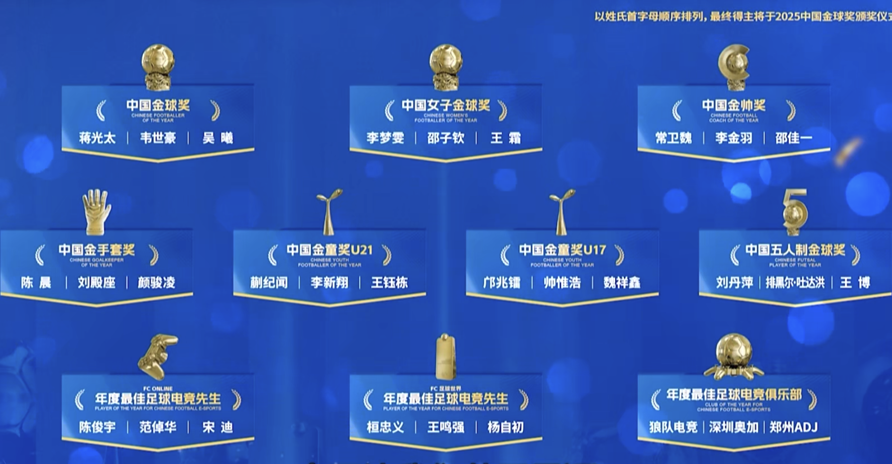 刘殿座力压颜骏凌以及陈晨,拿到中国年度金手套奖,他因伤没来到现场。邵佳一获得中国金帅奖,他在上赛季中超联赛中执教的青岛西海岸队取得第9名,获得足协认可,成为国足新任主教练,中国金帅奖的另外2位候选人则是李金羽跟常卫巍。